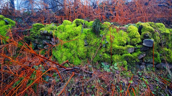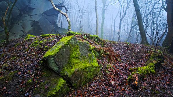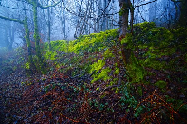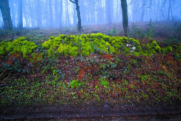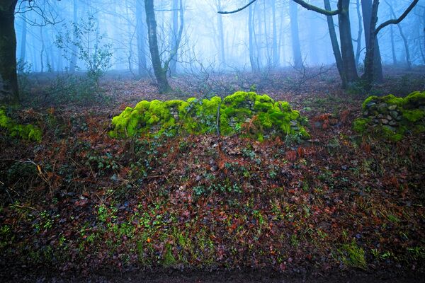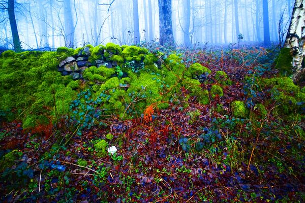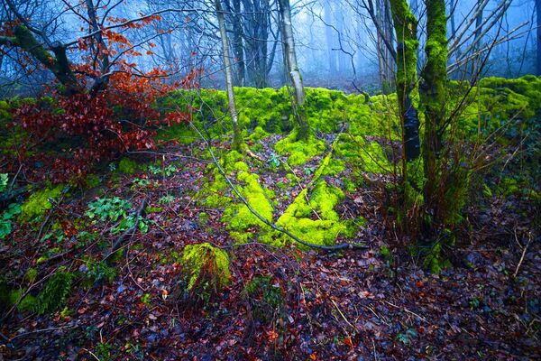 Series of images of a luminous moss embedded in the woodland landscape